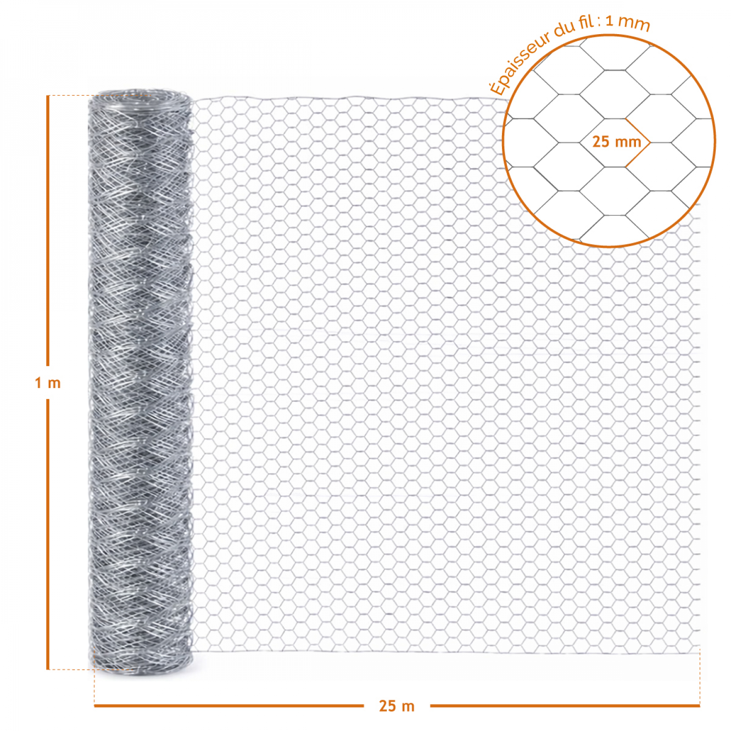 D'une longueur de 25 mètres pour une hauteur de 1 mètre, ce grillage est fabriqué en fil de fer galvanisé de 1 mm de diamètre, garantissant une bonne résistance à la corrosion, aux intempéries.