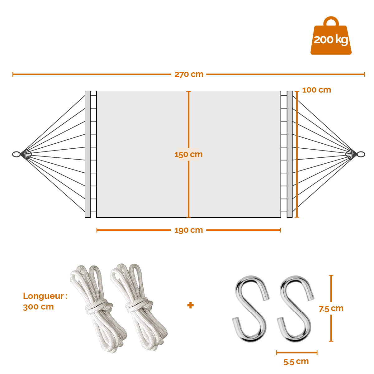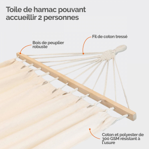 Chaque côté de la toile est composé de 20 fils de coton tressé, soutenus par deux barres en peuplier de 100 cm. L'ensemble assure une répartition homogène du poids et un maintien fiable. La longueur totale de la toile atteint 270 cm.