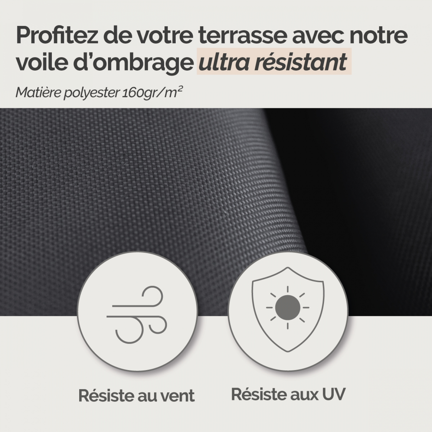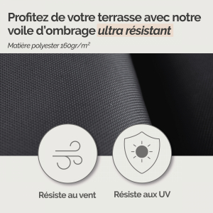 Conçu en polyester 160 g/m², ce voile d'ombrage se distingue par sa durabilité. Résistant aux fortes chaleurs, aux vents, et aux intempéries du quotidien, il est pensé pour rester en place et conserver son efficacité saison après saison.