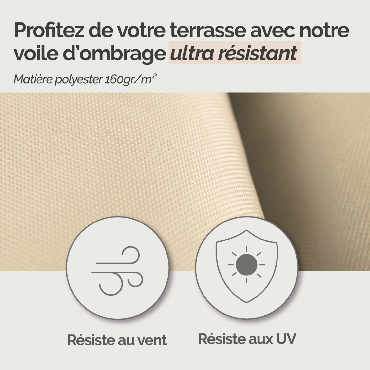 Conçu en polyester 160 g/m², ce voile d'ombrage se distingue par sa durabilité. Résistant aux fortes chaleurs, aux vents, et aux intempéries du quotidien, il est pensé pour rester en place et conserver son efficacité saison après saison.