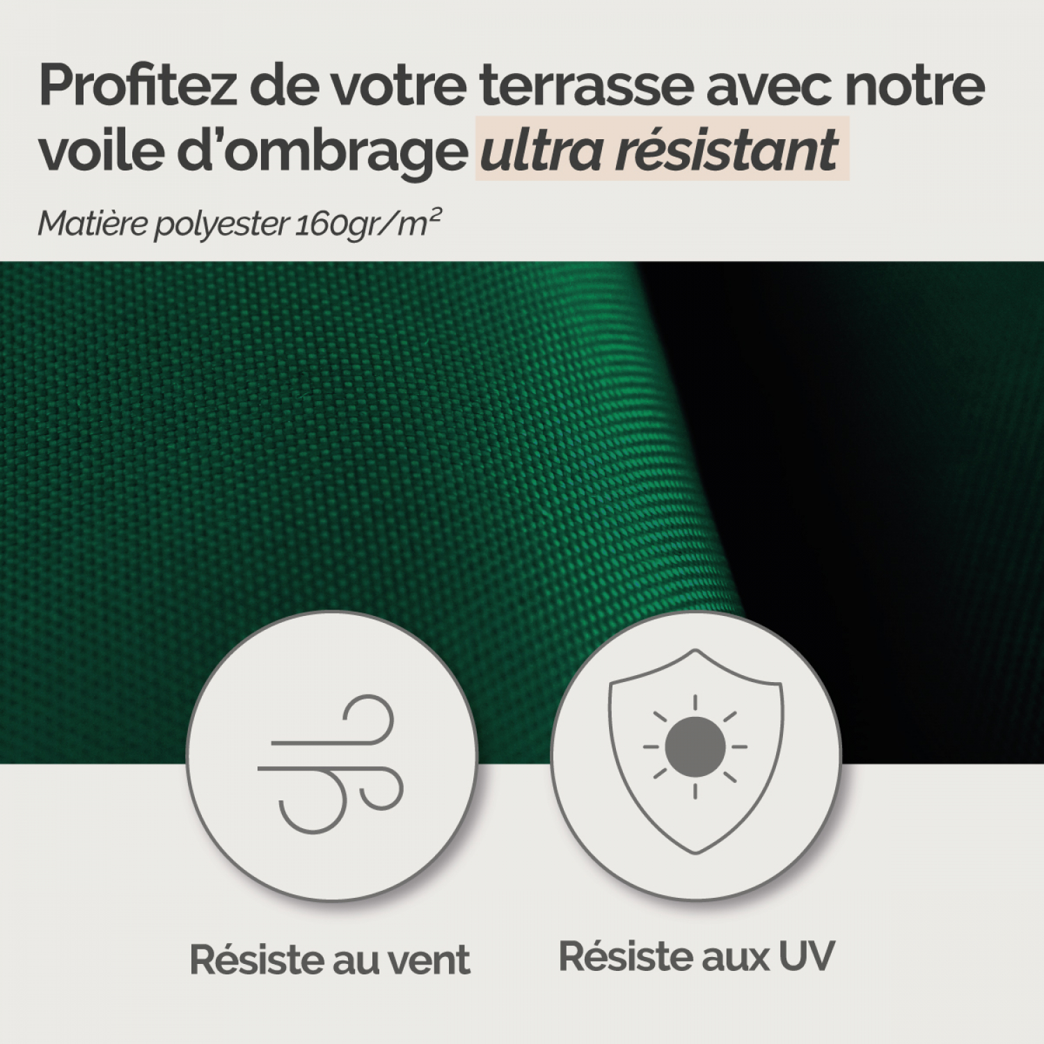 Conçu en polyester 160 g/m², ce voile d'ombrage se distingue par sa durabilité. Résistant aux fortes chaleurs, aux vents, et aux intempéries du quotidien, il est pensé pour rester en place et conserver son efficacité saison après saison.