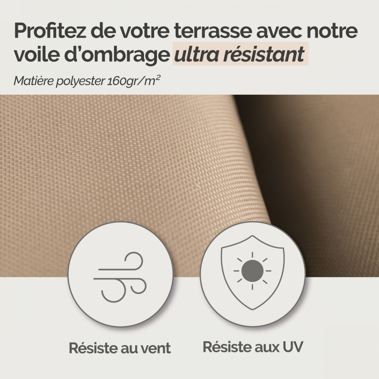 💪 RÉSISTANT Conçu en polyester 160 g/m², ce voile d'ombrage se distingue par sa durabilité. Résistant aux fortes chaleurs, aux vents et aux intempéries du quotidien, il est pensé pour rester en place et conserver son efficacité saison après saison. Polyvalent, il s'adapte à tous les usages : créer un coin repas protégé, abriter une cour, apporter de l'ombre en camping ou protéger votre véhicule contre le soleil.