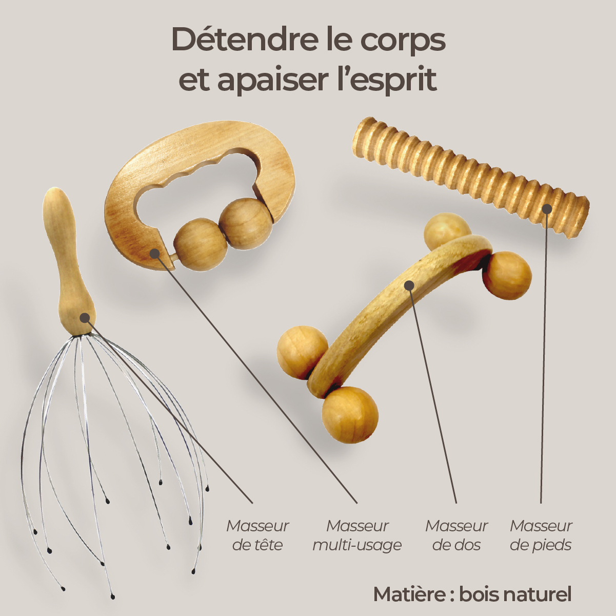Fabriqués en bois naturel, ces accessoires allient élégance, douceur au toucher et solidité. Le bois apporte une chaleur unique au contact de la peau, rendant chaque massage encore plus agréable et sensoriel.
