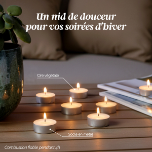 Avec leur durée de combustion de 4 heures, elles diffusent une lumière stable et durable, parfaite pour accompagner un dîner romantique, une soirée entre amis ou un moment calme au coin du feu. Et parce qu’elles sont inodores, elles laissent toute la place aux parfums naturels de votre intérieur ou aux délicieuses saveurs de vos plats.