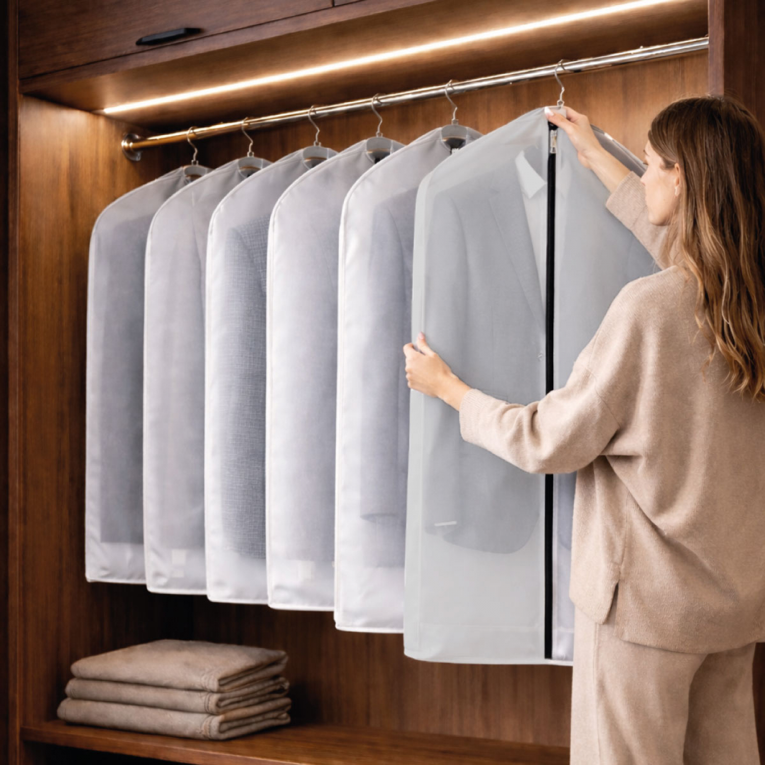 Fabriquées en PEVA transparent associé à un tissu non tissé opaque, ces housses offrent un parfait équilibre entre légèreté, durabilité et protection. Leur matériau semi-translucide permet de repérer facilement vos vêtements sans avoir à ouvrir la housse, tout en préservant une esthétique discrète et soignée dans votre dressing.