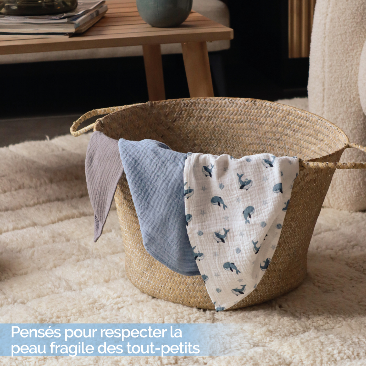 🌿MATIÈRE NATURELLE La mousseline de coton est une matière naturellement douce et aérée, qui laisse circuler l'air pour éviter la surchauffe tout en procurant une sensation de bien-être. Lavage après lavage, les langes deviennent encore plus souples, offrant à votre bébé un cocon rassurant au quotidien.