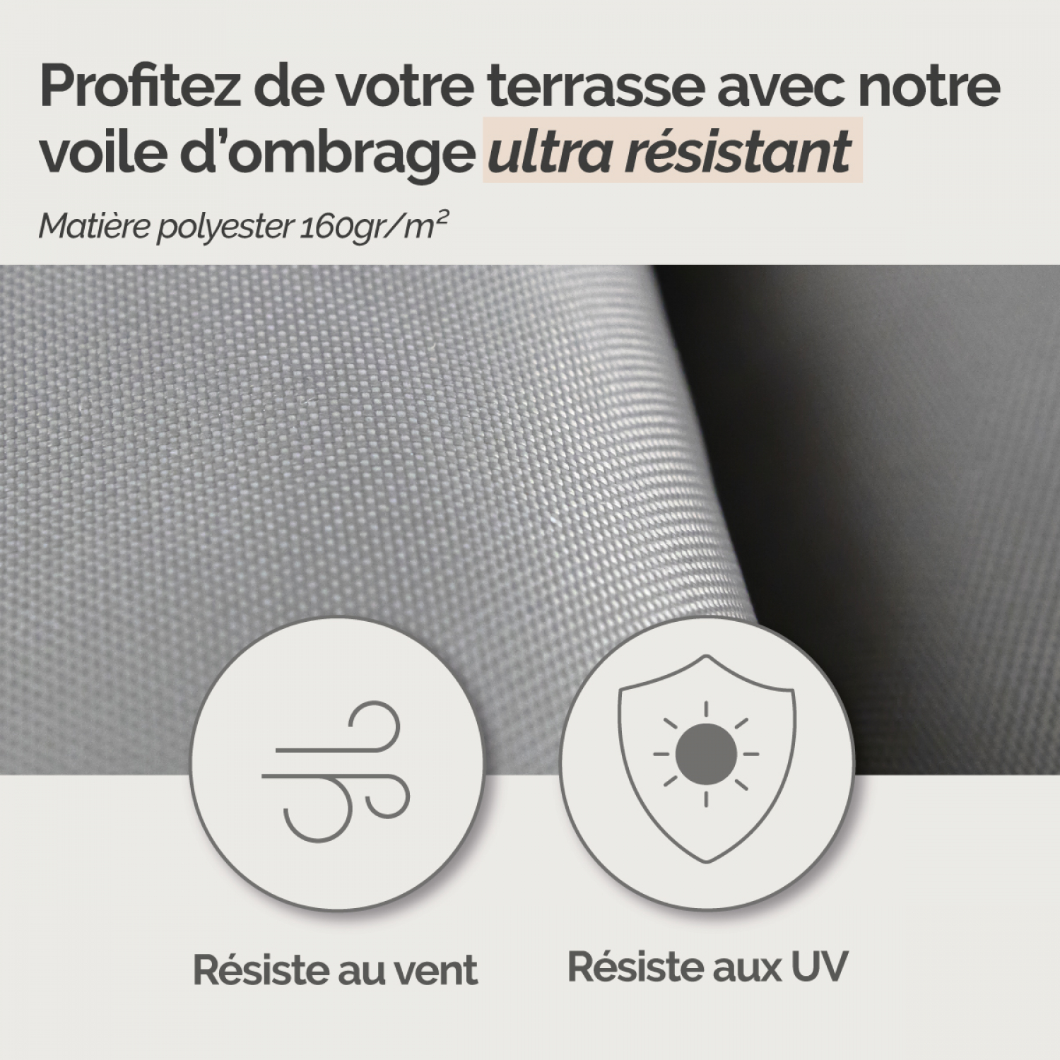 Conçu en polyester 160 g/m², ce voile d'ombrage se distingue par sa durabilité. Résistant aux fortes chaleurs, aux vents, et aux intempéries du quotidien, il est pensé pour rester en place et conserver son efficacité saison après saison.